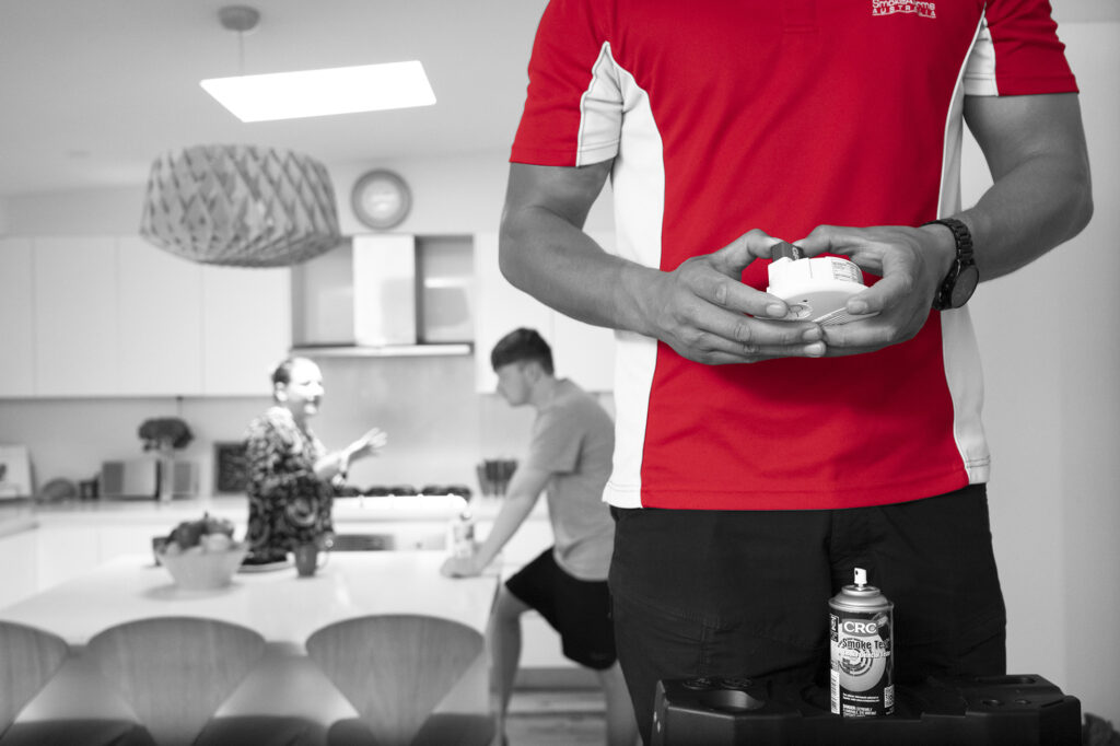 A smoke alarm technician performing a smoke alarm test in the kitchen of a residential home. The technician is holding the smoke alarm, checking the battery, and there is an artificial smoke simulator nearby.